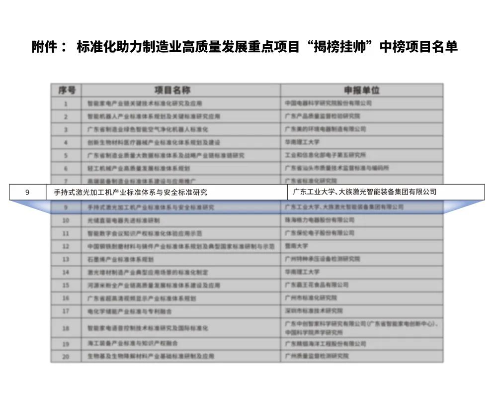 近日,廣東省市場監督管理局發布標準化助力制造業高質量發展重點項目“揭榜掛帥”中榜項目名單,由大族激光全資子公司大族激光大族激光智能裝備集團有限公司(簡稱:大族激光智能裝備集團)與廣東工業大學承擔的“手持式激光加工機產業標準體系與安全標準研究”項目上榜。