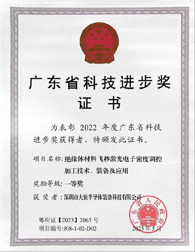 2023年5月,由深圳市大族半導體裝備科技有限公司、北京理工大學珠海學院、廣州國顯科技有限公司、北京理工大學、中國船舶集團有限公司第七〇七研究所聯合申報的“絕緣體材料飛秒激光電子密度調控加工技術、裝備及應用”項目,榮獲2022年度“廣東省科技進步獎”一等獎。